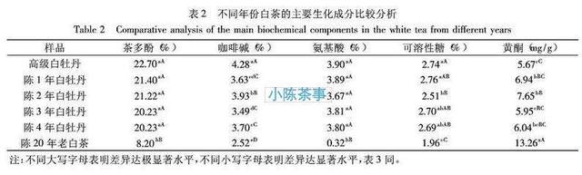 咖啡碱也是组成白茶滋味的重要组成部分,是茶汤苦涩的基本来源,并具有提神醒脑、帮助消化、减肥降脂、利尿排毒等功效。咖啡碱和茶黄素相结合,就能形成独特的鲜爽味。从表中数据可知,陈放了1~4年的白茶,咖啡碱含量变化不大,波动较小。
