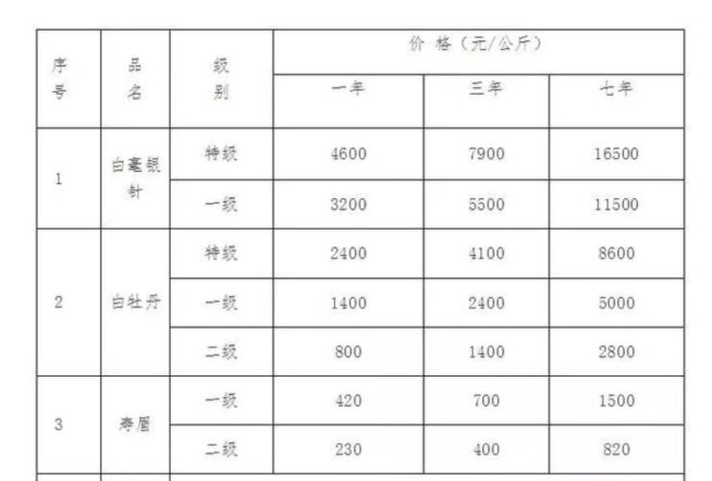 根据福鼎市茶业协会发布的《福鼎白茶系列产品市场参考价》,一年的福鼎白毫银针,价格为3200-4600元一斤,一般都是散茶;三年的福鼎白毫银针,市场参考价格为5500-7900元每斤。而七年的福鼎白毫银针,市场参考价格为11500-16500元一斤。