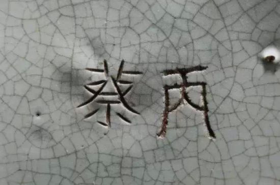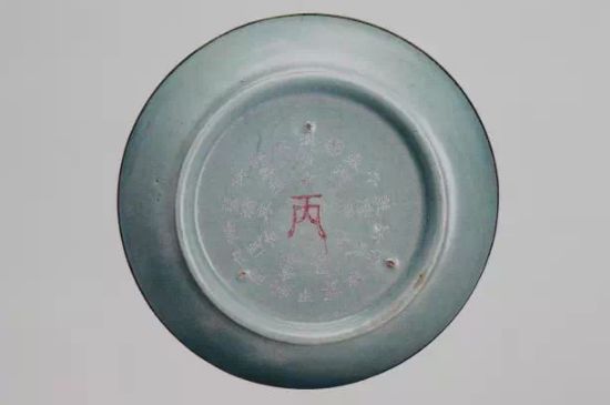 院藏汝窑“丙蔡款碟”,平底无足,器外有支钉痕三枚,开片线纹呈黑色,底刻“丙”、“蔡”二字。