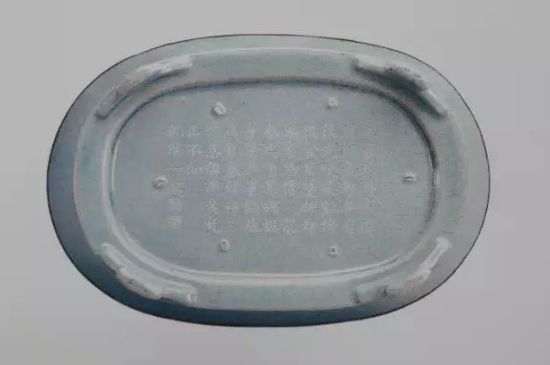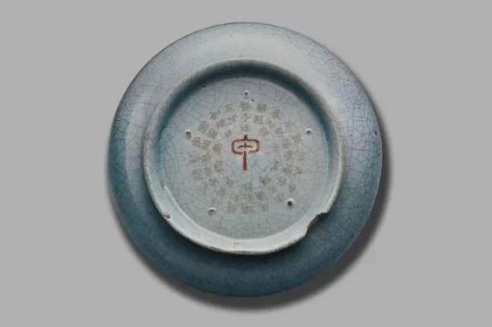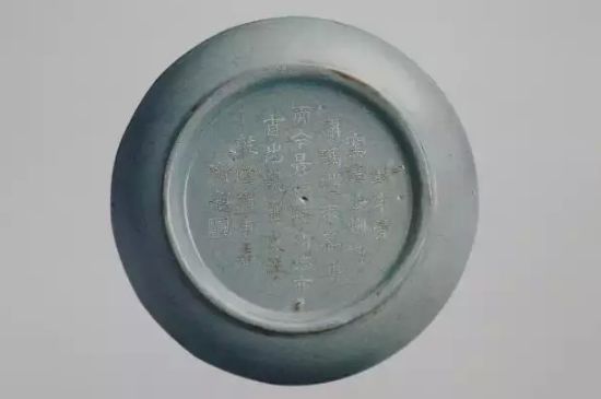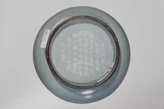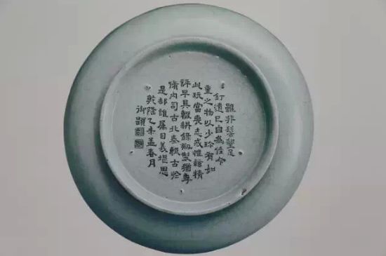 底刻清高宗乾隆皇帝御制诗(1772):“盘子径五寸,如规口面圆,出陶无髻垦,阅世独完全,冰裂纹隐约,铁定迹局连,底心镌甲字,先得此同然。”乾隆壬辰新春御题。钤印二:“太?”“古香”。