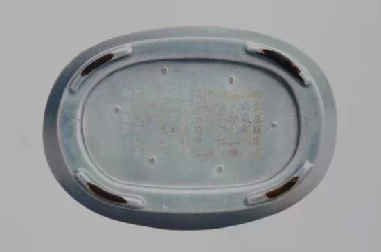 底刻清高宗乾隆皇帝御制诗(1779):“赵宋青窑建汝州,传闻玛瑙末为釉,而今景德无斯法,亦自出蓝宝色浮。”乾隆丙申春御题。钤印一:“朗润”。