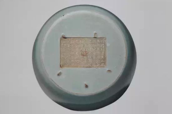 底刻清高宗乾隆御制瓷诗(1774):“淡青冰裂细纹披,秘器犹存修内遗。古丙科为今甲第,人才叹尔或如斯。”乾隆甲午春御题。钤引一:“双龙乾卦印”,底心阴刻篆书“丙”字款。