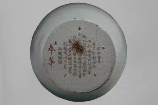 底刻清高宗乾隆皇帝御制诗(1778):“定州白恶有芒形,特命汝州陶嫩青,口欲其坚铜以锁,底完而旧铁余钉,合因点笔意为静,便不簪花鼻亦馨,当日奉华陪德寿,可曾五国憶留停。”乾隆戊戌仲夏御题。鈐印二:“古香”,“太?”。