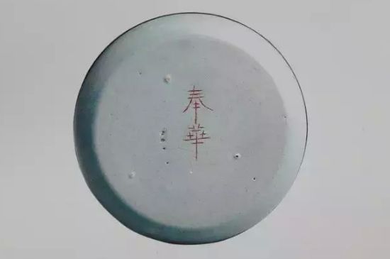 此碟圆口、浅弧形壁、平底无足。相似的标本,亦见于宝丰县清凉寺汝窑窑址。口沿嵌一铜扣,底部留存三枚细小的支钉痕,中心刻”奉华”两字铭款,刻痕内填跦红,为国立故宫博物院典藏中,三件后题有“奉华”铭款的作品之一。
