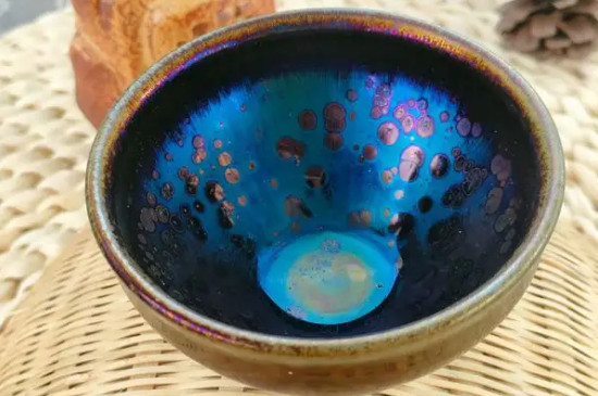 曜变盏是黑色底釉上聚集着许多不规则圆点的建盏,其不规则圆点被称之为曜斑。耀斑分布于建盏的内壁上,会随着视角的变化发生变化,当从垂直角度观察曜变盏时,曜斑呈蓝色,斜看曜变盏时,曜斑闪金光,显得分外闪耀。