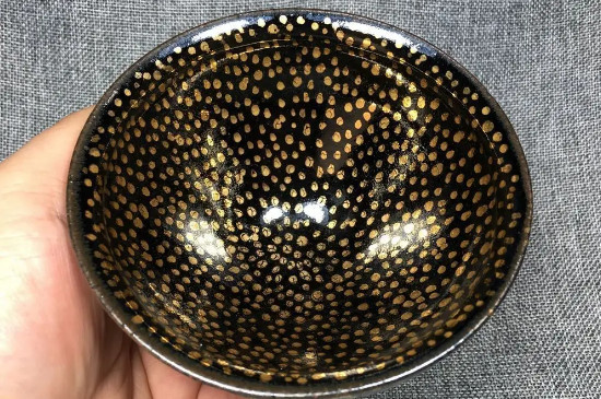 油滴盏是在乌黑的底釉上,散布着金黄色或银灰色金属光泽的小斑点的建盏,因其与散落在地的油滴相似从而得名。从油滴的特征来看,油滴盏有金油滴”和“银油滴”两种,与曜变盏相似,是不可多得仅次于曜变盏的建盏珍品。