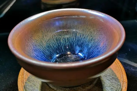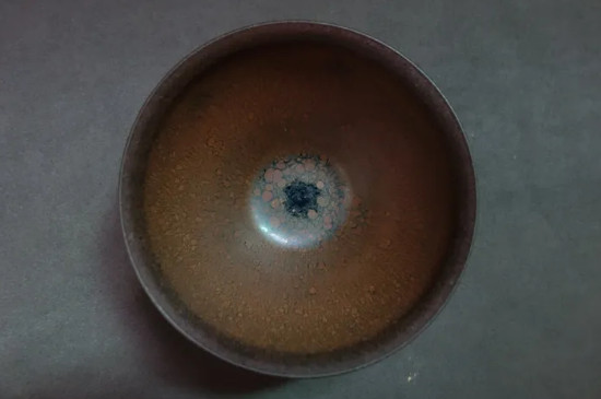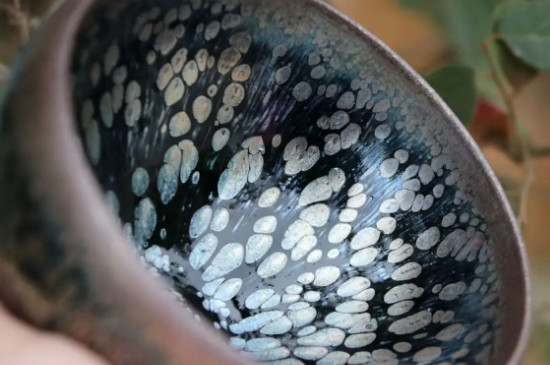 “曜变”是指在黑色的底釉上聚集着许多不规则的圆点,也就是耀斑,曜斑广布于建盏的内壁,并随所视方向的移动而变化,垂直观察时呈蓝色,斜看时闪金光,仿佛置身于浩荡宇宙之中,周围是无数璀璨的繁星。