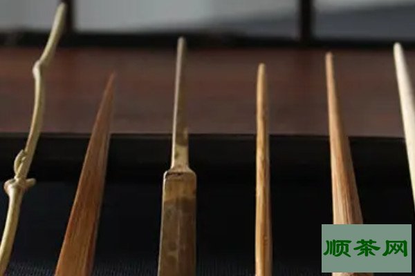 茶针也叫茶通,是茶道六君子之中必不可少的茶具,一般用来撬茶,尤其是紧压后的茶砖,用茶针撬茶砖时,一只手按住茶砖,另一只手握住茶针从侧面插入,沿着缝隙插入茶砖后稍微向上用力就能撬下一片茶叶,然后顺着撬开的位置逐渐把整个茶砖解散。