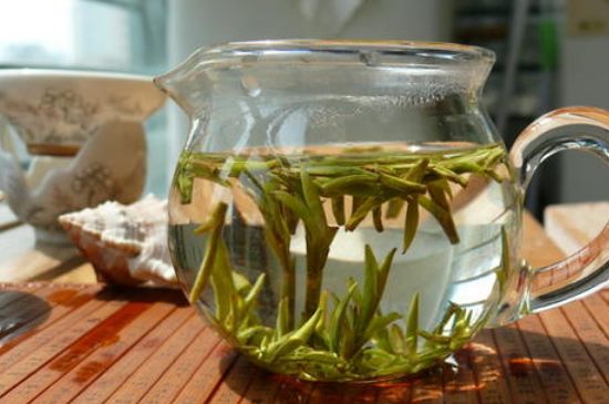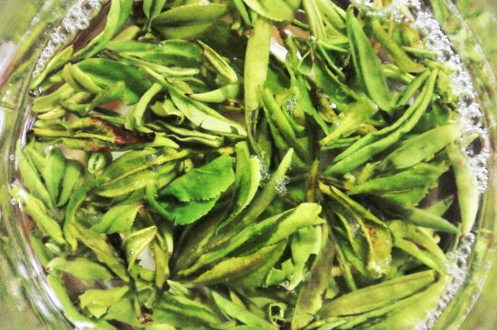 看那叶似鹊嘴,形如秀柳,汤呈青绿,清澈得叶片可数。水面点点白雪,色彩有对比,淡雅适度,此茶不仅淳香可口,尚有观赏价值。书画名家黄纯尧教授饮此茶即赋诗:“天生丽质明前芽,清香入骨窨制花,叶形汤色皆佳品,异军突起徐公茶。”