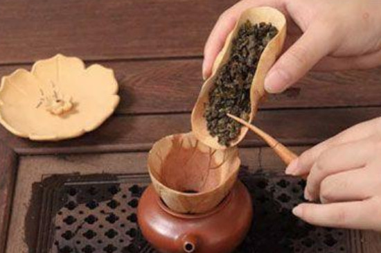 第二步、纳茶——将茶叶分粗细后,分别装入茶壶,粗者置于底、中者置于中、细者置于上,茶叶不可装得太满,七八成即可。