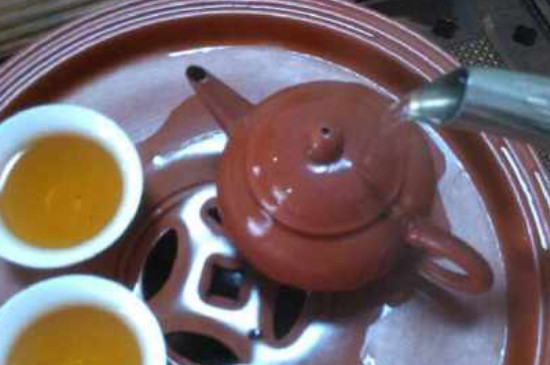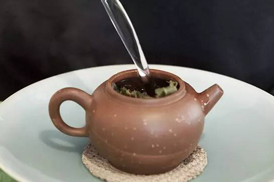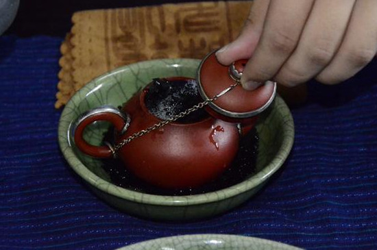 第六步、淋罐——茶壶盖好后,马上用开水冲淋壶盖,这样既可冲去溢出的茶沫,又可使茶叶内外受热。