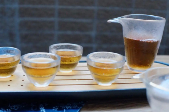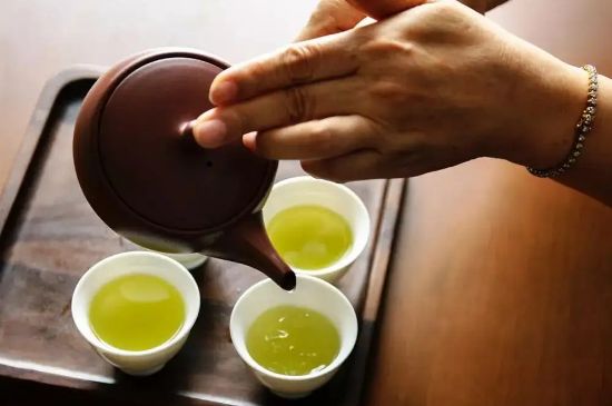 将公道杯里的茶汤,沿着品茗杯的边缘,缓缓倒入每个客人的杯中,注意“茶斟七分满”,表示对客人的尊敬。
