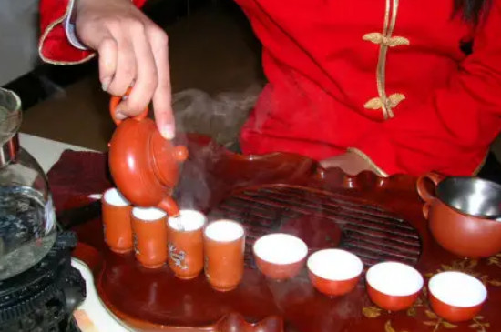 当壶中茶水剩下少许时,再次改为逐个点斟的手法称之为韩信点兵,经过这两道程序,茶也就分好了,但相同的是每杯茶都是没有斟满的,因为古人云:七分茶,八分酒。酒满敬人,茶满欺人,茶没有斟满是表示主人对大家的尊敬。