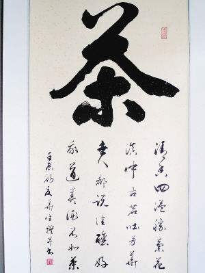 一幅王国强先生的《茶》字书法,挂在茶室内,太有品味了。一杯茶,品人生沉浮。平常心,造万千世界。同样一杯茶,教授品味出的是富有哲理的人生,画家品味出的是富有色彩的人生,音乐家品味出的是富有节奏的人生,诗人品味出的是富有韵律的人生,医生品味出的是富有健康的人生,我品味出的是富有价值的人生。