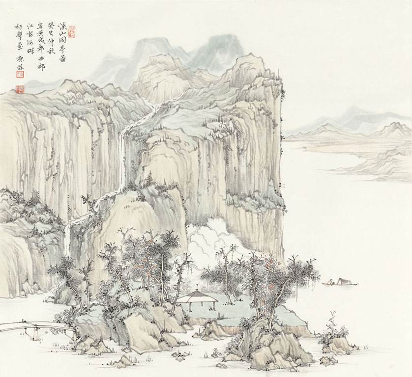 唯恐挥杆惊鱼梦,只钓清闲不钓鱼。图中的亭台楼阁掩映于溪水边林木旁,画中溪江上高人垂钓,人物虽小极具神韵,题词“溪山垂钓图”可见无欲无求的隐士慈爱之心。远景山云缥缈氤氲,别具延伸之感。