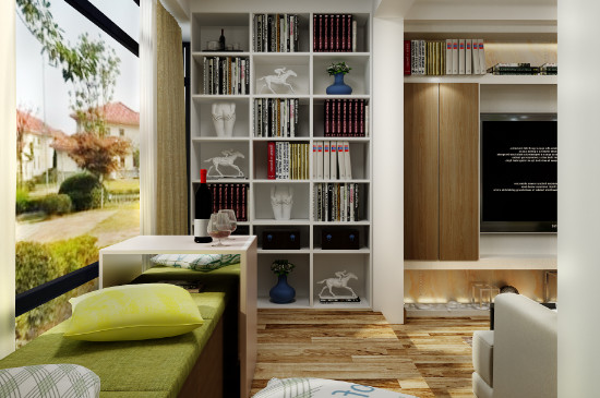 客厅茶桌还可以摆放在阳台,将客厅与阳台打通,连成一片,扩大了家居空间和活动范围。阳台墙面定制开放式书柜,飘窗设计成榻榻米,在榻榻米中间设计一方小茶桌,在这里捧一本书,泡一壶茶,就能度过一个曼妙的午后时光。