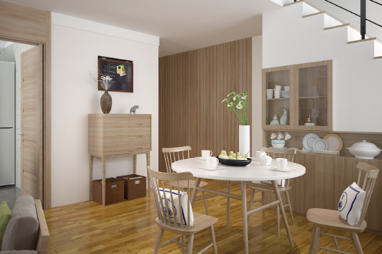 圆形木桌既可以当作餐桌,又可以是茶桌,摆放在楼梯下方空间,丝毫不影响其他活动区域;清新的原木纹理,洁白的桌面与白色茶具相融合,呈现出整洁纯净之感,与整个家装风格相一致。