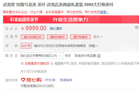 武夷岩茶中大红袍无疑是最具有代表性的那一个,冲泡后汤色橙黄明亮,兰花香香高而持久,岩韵明显。武夷星是武夷岩茶中头部品牌之一,9999大红袍每年限量999份,每一份都有编码,9999元/60g共计7泡,1428元/泡。