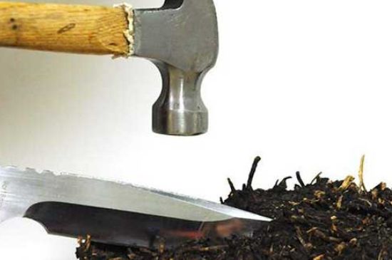 5、用匕首加榔头:准备一把匕首、榔头。将匕首从茶砖边缘切入,然后用榔头捶匕首上方,使匕首往茶砖里切。切入三厘米左右时,匕首用力上下撬动,把茶砖撬开。再一点点切取茶砖的其余部分,直至茶砖撬取完成。
