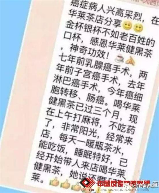 为了能显示华莱黑茶神奇的效果,华莱经销商不是发布一些喝华莱黑茶能治疗癌症好的案例,而这些华莱黑茶神奇功效的推广案例在网络上很容易找到。