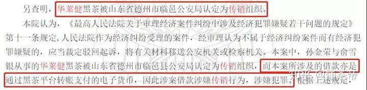 最新案件为2019年10月31日发布的江苏省淮安市中级人民法院的裁决,内容明示称,“华莱健黑茶被认定为传销组织”。