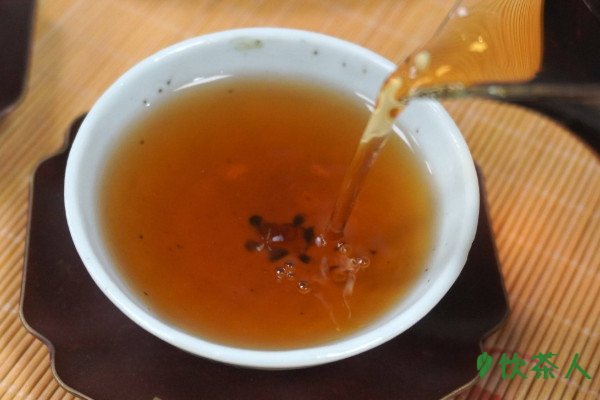 功夫茶泡饮黑茶时,选择专门泡黑茶的茶具,冲泡期间实现茶水分离,同样从饼茶上撬茶15克干茶叶投入杯中,注入100度以上沸水泡茶香和茶汤,等待茶汤变为明亮的橙红色即可出汤,先将茶汤倒入茶海,然后分入品茗杯中饮用。