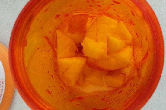 3、晾至常温之后,我们将其放入榨汁机中,榨成桃子果肉汁。如果直接喝的话,那么在打成果汁的时候可以多放一点水,打完之后即可直接喝;当然也可以打得浓稠一点,就是我们在打果肉汁的时候不加清水,打好后放到密封罐中,然后要放到冰箱里,以后可以兑水喝。