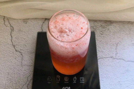 《冷》草莓原浆50克+奶精45克+开水220克+冰块140克。