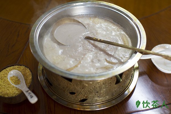 小米炒香后,倒入冲泡好的茶汤搅拌均匀,然后开始熬制茶汤,沸腾后把准备好的鲜奶倒入锅中,加入少量食用盐,为了防止鲜奶长期处于过高温度下,生成不利于健康的糖基化终产物,熬煮期间需要不断的扬沸,起到适当降低温度的作用。