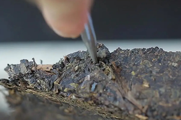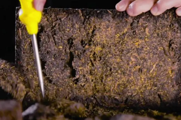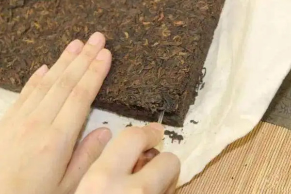 如果茶砖过于紧密,周围没有能让茶刀插入的缝隙时,可以选择茶锥进行解茶,把尖锐的部分插入茶砖内部,在表面形成一排密集的线条孔,茶砖放在桌子的边缘处,借助外力的作用沿着线将茶砖掰开即可。