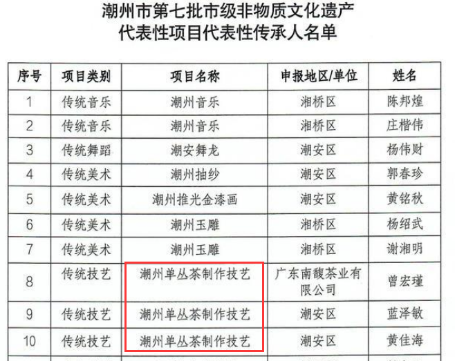 凤凰单丛茶,产自广东省潮州市潮安区,因出产于凤凰镇的凤凰山而得名。关于凤凰单丛非遗传承人有几位,可以在广东省文化和旅游厅、潮州市文化和旅游厅等政府官网上进行查询,了解省级、市级非物质文化遗产名录及相应传承人名单目录。下面顺茶网搜集了部分如下: