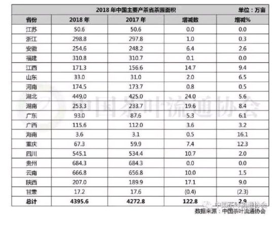 2018年全国18个主要产茶省(区、市)茶园面积4395.6万亩,增加123万亩,增长率为2.9%,到了2019年茶园面积增长到了4597.87万亩。关于2019年中国茶叶产量省份排名,详细数据可点击查看文章《2019年中国茶叶产销形势报告》。