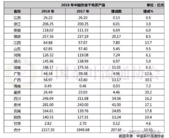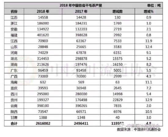 2018年各省茶叶产量排名