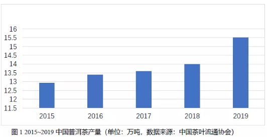 据中国茶叶流通协会最新数据:2019年,中国普洱茶产量约为15.5万吨,较前一年度上涨1.5万吨,同比增长10.7%,占云南省同年茶叶产量的36.8%,占全国茶叶总产量的5.55%;普洱茶农业产值约78.3亿元,占全国茶叶农业总值的3.26%。相较于2015年的12.93万吨和46.4亿元,分别累增19.88%和68.8%。