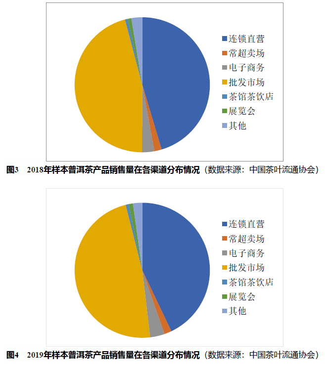 据中茶协普洱茶专委会对普洱茶产销企业的调研显示:传统的零售渠道与批发市场仍是普洱茶最主要的销售渠道——2019年,普洱茶在连锁直营店和批发市场的销售量虽同比上一年有小幅减少,但仍分别占被调研企业销售量的42.9%和47.9%。与此同时,电商渠道从2018年销量份额的2.92%增至2019年的3.48%,势头较旺。