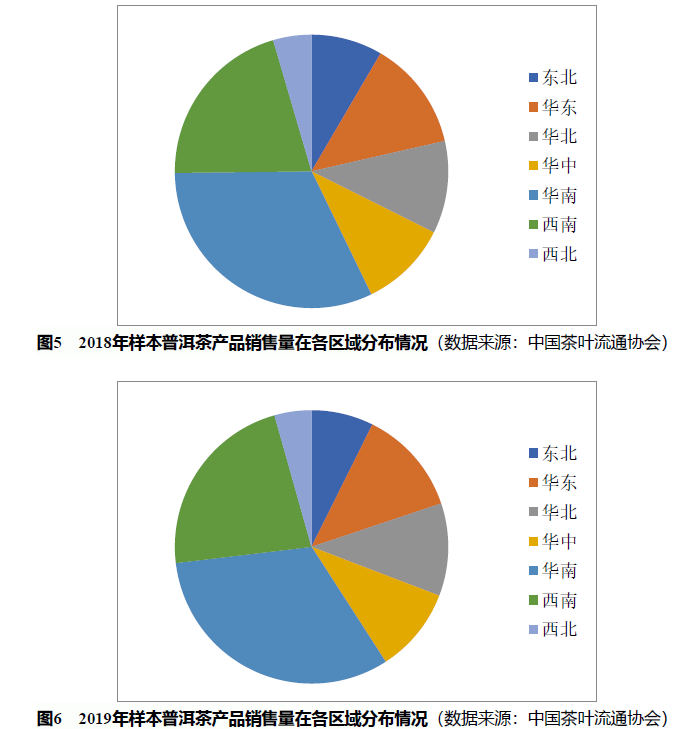调研结果显示:华南地区仍是普洱茶的主销区域,2019年普洱茶销售量占到样本总销量的32.2%;其次是云南省所在的西南地区,华东、华北、华中居后。普洱茶消费向全国市场拓展的形势已经十分明显。东北和西北市场的普洱茶消费总量不高,但未来可期。