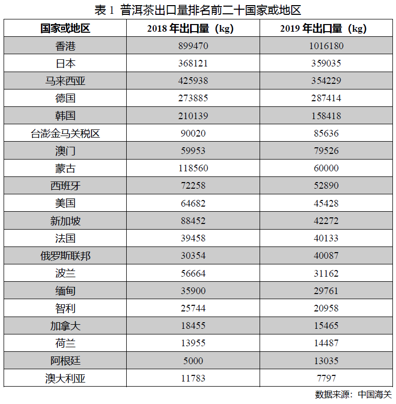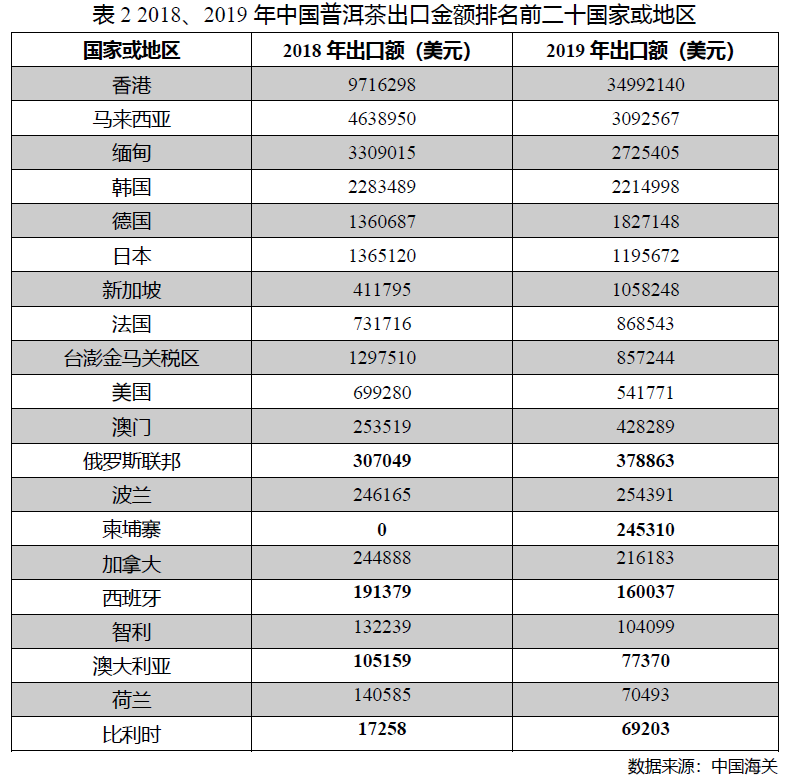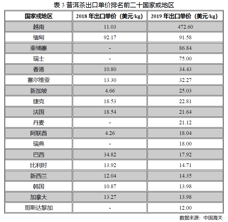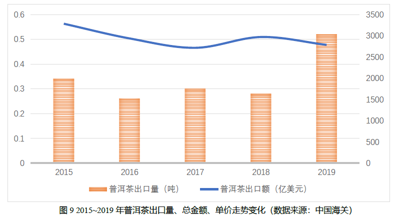 2019年,中国普洱茶出口数量为2786吨,同比2018年下降6.2%,占国内茶叶出口总量的0.76%;出口金额0.52亿美元,同比增长85.7%,占茶叶出口总额的2.6%;出口均价18.7美元/公斤,同比上涨98.9%。