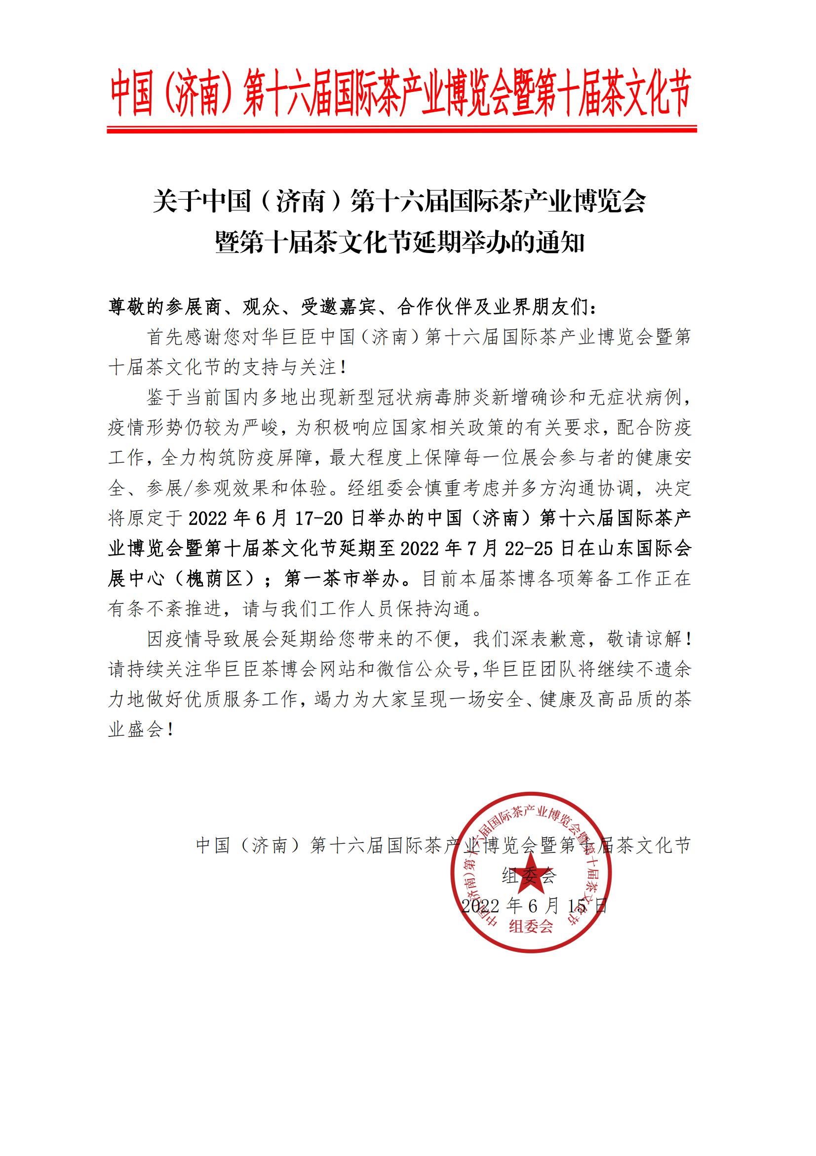 重磅官宣 7月22日-25日, 中国(济南)第十六届国际茶产业博览会 暨第十届茶文化节, 将在山东国际会展中心(槐荫区); 第一茶市举办! 品牌荟萃 共谋发展 本届茶博会展览面积达...