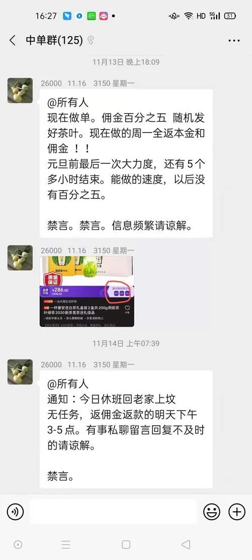 此外,不同的受访者均告诉网记者,一杯香茶业做这种派单的工作人员并不只有一人,并提供了相应微信群的聊天截图。这种免费送茶叶,下单返本金赚佣金的行为,似乎是一杯香茶业惯用的一种销售经营模式。