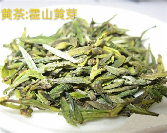 6、霍山黄芽:干叶直条带有轻微展开的叶子,覆盖着丰富的白色尖端;深绿色,略带黄色。有板栗香气,轻微花香。茶汤明亮清澈,呈浅黄色。