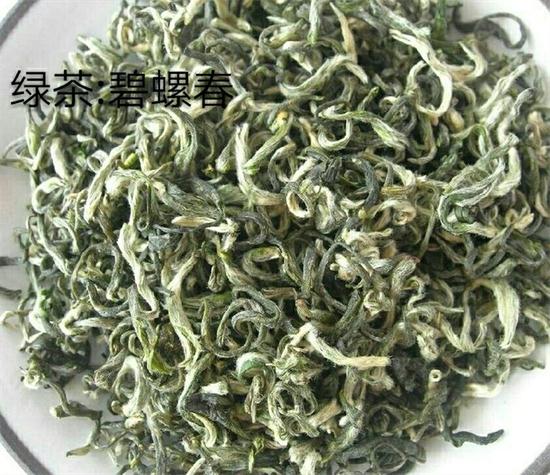 10、碧螺春:干茶条索紧结,卷曲如螺,茸毛遍布,白毫毕露,银绿隐翠,叶芽幼嫩,冲泡后茶叶徐徐舒展,上下翻飞,茶水银澄碧绿,清香袭人,口味凉甜,鲜爽生津。