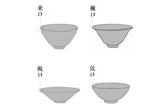 碗盏型的四大种类,分别是束口、撇口、敞口、敛口。