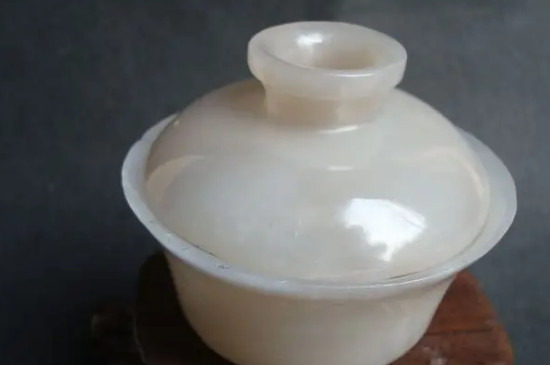白玉,无杂质。器呈圆球形,侈口,圈足。通体光素无纹。器型规整,琢磨圆润,闪玻璃光泽。白玉盖碗的优势:“白”利于观察叶底;“玉”的材质不导热,使用时不烫手。