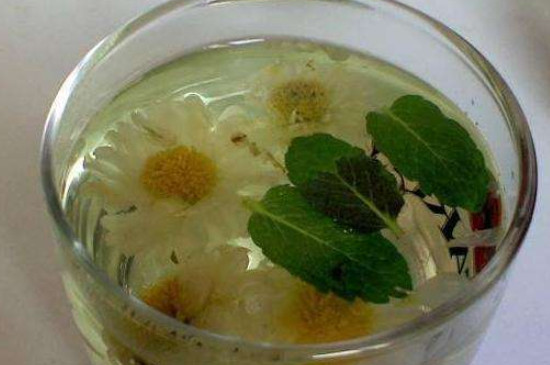薄荷3钱、菊花2钱。将菊花与薄荷一起放入茶杯中,加盖冲泡5~10分钟即可。菊花可清热解毒、缓解疲劳作用,与具有提神效果的薄荷一起冲饮可使效果更佳。