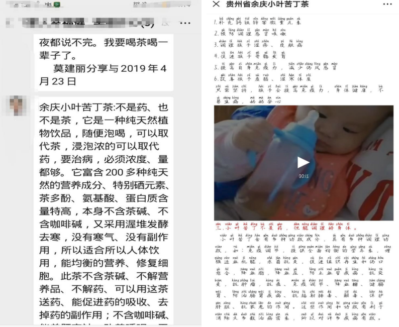 包治百病,商家鼓吹有毛病的人喝了才会觉得苦,身体越好就慢慢不苦了,并且近期发现商家联合一些群众每天在一个群里做各种分享,类似虚假的病人现身说法,说是治好了他们的癌症什么什么的,还找来了孕妇和小孩让他们拍出来喝茶的视频,小孩不喝奶粉该喝苦丁茶,对我妈妈和亲戚进行各种洗脑,让他们产生心理作用,真感觉自己越喝身体越好了。并且联动蛊惑更多的群众大量消费余庆小叶苦丁茶。