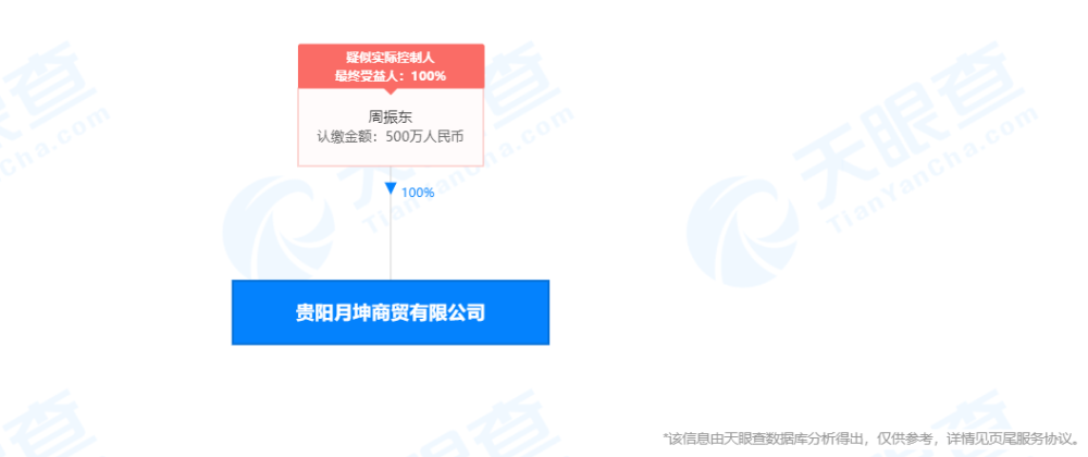 据天眼查APP显示,贵阳月坤商贸有限公司成立于2015年7月14日,实缴资本为120万元,周振东担任法人、执行董事兼总经理,持股100%。