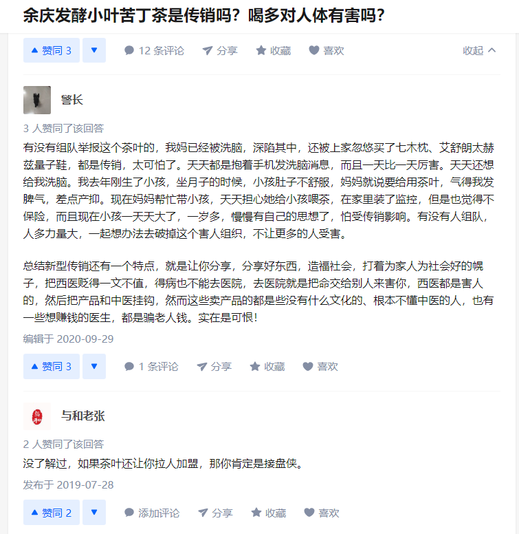 此外,不少网友在“知乎”上发文投诉,据某网友写道,母亲被亲戚介绍于今年4月开始大量购买苦丁茶,每天沉迷于喝大剂量高浓度的苦丁茶,甚至焖过夜茶第二天喝,说是强身健体。