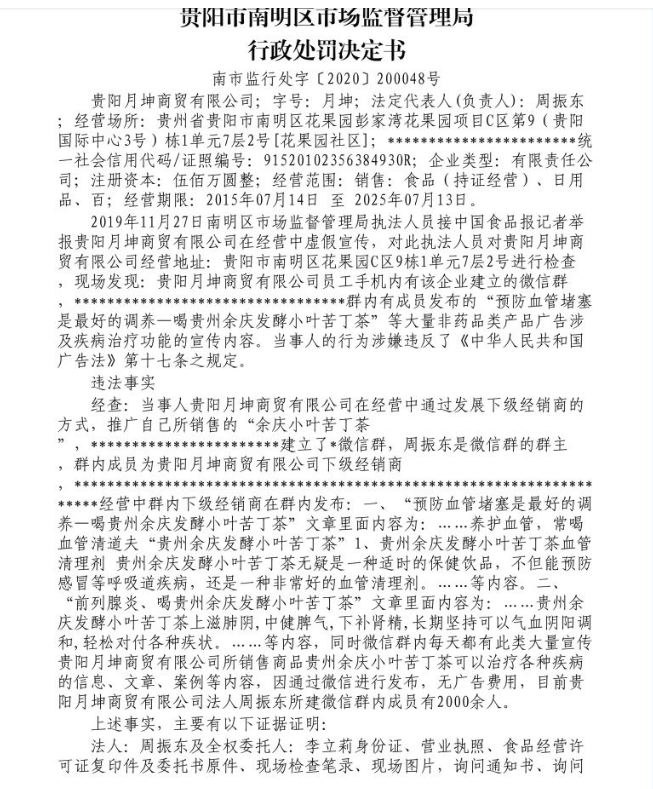 二、“前列腺炎、喝贵州余庆发酵小叶苦丁茶”文章里面内容为:……贵州余庆发酵小叶苦丁茶上滋肺阴,中健脾气,下补肾精,长期坚持可以气血阴阳调和,轻松对付各种疾状。……等内容,同时微信群内每天都有此类大量宣传贵阳月坤商贸有限公司所销售商品贵州余庆小叶苦丁茶可以治疗各种疾病的信息、文章、案例等内容,因通过微信进行发布,无广告费用,目前贵阳月坤商贸有限公司法人周振东所建微信群内成员有2000余人。
