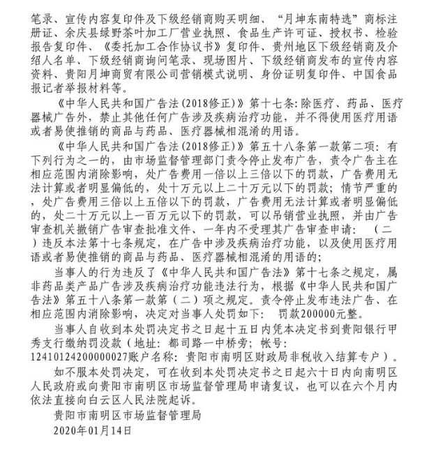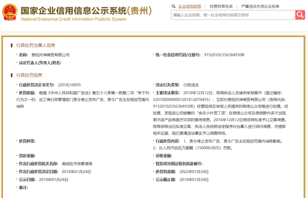 此外,国家企业信用信息公示系统还显示,贵阳月坤商贸有限公司于2018年1月24日,同样因违反《广告法》被罚15万元。