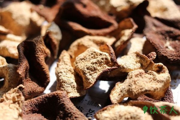 陈皮外表的颜色也是判断年份的方式,通过把不同年份的陈皮摆放在一起对比可以发现,5年以下的陈皮表面颜色为浅棕色,果皮的纹路明显,内里泛黄且略带白色,超过10年的陈皮外表为深棕色,浅色内囊有明显脱落。